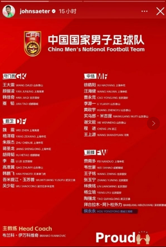 侯永永终于入选了最新的国足名单,这一次伊万听取了外界的观念,让他归国试试水平,侯永永在知说念我方入选后的3个细节就足以讲明,他是当今国足最有包摄感的归化球员,也冲突了之前好多东说念主关于他效劳国足意愿不彊的传言。